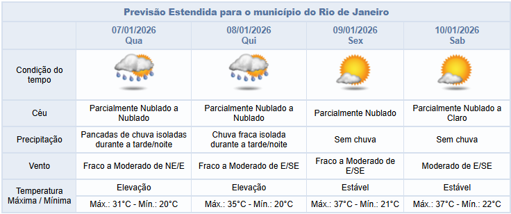 Entre sexta-feira (09/01) e sábado (10/01), haverá redução de nebulosidade na cidade do Rio e não há previsão de chuva. Os ventos estarão fracos a moderados, sendo mais intensos no sábado e as temperaturas estarão elevadas.