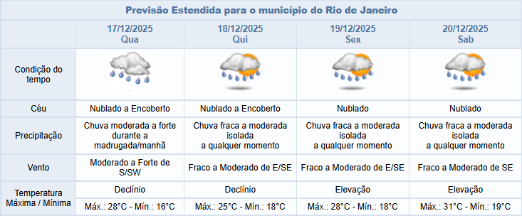 Na quarta-feira (17/12), a passagem desta frente fria manterá o tempo instável, com previsão de céu nublado a encoberto e chuva moderada a forte nos períodos da madrugada/manhã, passando a fraca a moderada isolada a partir da tarde. Os ventos estarão moderados a fortes e as temperaturas estarão em declínio acentuado.