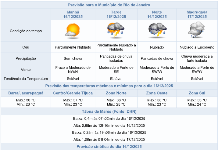 Segundo o Sistema Alerta Rio, as condições de tempo na cidade do Rio, nesta terça-feira serão influenciadas pelo calor e aproximação de uma frente fria no fim do dia. Haverá aumento gradativo de nebulosidade e há previsão de pancadas de chuva nos períodos da tarde e noite, podendo vir acompanhadas de raios e rajadas de vento moderado a forte. As temperaturas estarão elevadas, com máxima prevista de 38°C.