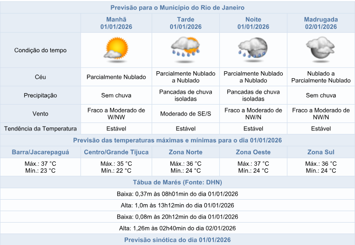 De acordo com o Sistema Alerta Rio, nesta quinta-feira (01/01), primeiro dia de 2026, o tempo na capital fluminense será influenciado por áreas de instabilidade associadas ao calor e umidade. O predomínio será de céu parcialmente nublado e nos períodos da tarde/noite há previsão de pancadas de chuva isoladas. Os ventos irão variar entre fracos a moderados e as temperaturas seguirão estáveis e ainda elevadas, com máxima prevista de 37°C.
