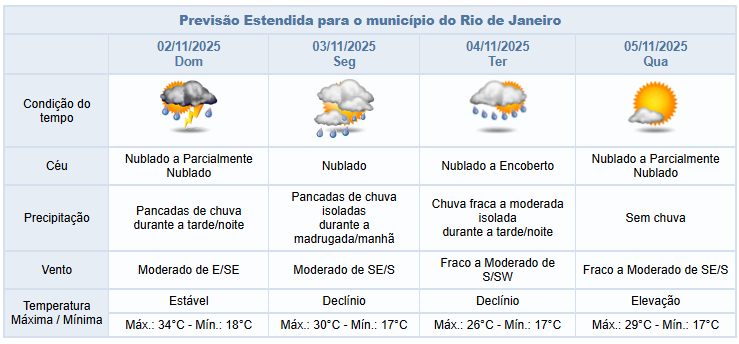 No domingo (02/11), áreas de instabilidade com o calor irão influenciar o tempo na cidade do Rio. O céu estará nublado a parcialmente nublado e há previsão de pancadas isoladas de chuva nos períodos da tarde e noite, podendo vir com raios.