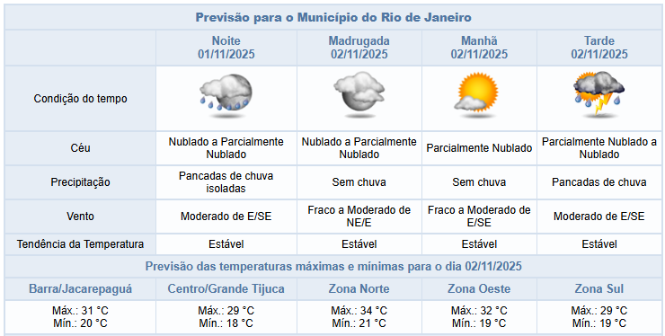 Para o fim de tarde e noite deste sábado (1/11), o carioca pode esperar céu parcialmente nublado e ventos moderados, com previsão de pancadas de chuva na parte da noite. Ao longo do dia, a nebulosidade esteve variada e não houve registro de chuva até o momento. Os ventos estiveram fracos a moderados, sendo mais intensos no período da tarde e as temperaturas apresentaram elevação em relação ao dia anterior, com mínima registrada de 17,1°C e máxima de 32,5°C.