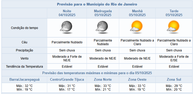 Segundo o Alerta Rio, o final de tarde e noite deste sábado (04/10) será de céu parcialmente nublado e sem chuva na cidade do Rio. Ao longo do dia, o céu esteve parcialmente nublado e não houve registro de chuva. Os ventos estiveram fracos a moderados durante a manhã, passando a moderados durante a tarde e as tempertauras permaneceram estáveis em relação ao dia anterior, com mínima de 16,9°C e máxima de 32,7°C.