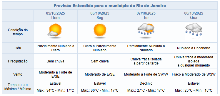 Domingo e segunda-feira (05/10 e 06/10), a nebulosidade estará variada e não há previsão de chuva. As temperaturas permanecerão elevadas, e os ventos estarão predominantemente moderados, principalmente nas regiões próximas do litoral.