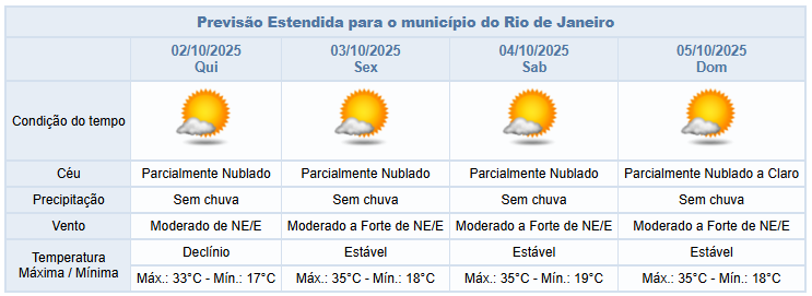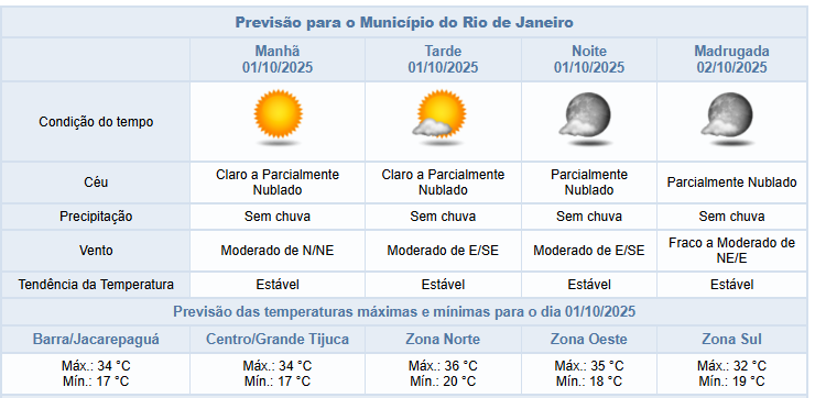 Segundo o Alerta Rio, esta quarta-feira (1º/10) será mais um dia de tempo estável e temperaturas elevadas na cidade do Rio de Janeiro. O céu estará claro a parcialmente nublado e não há previsão de chuva. Os ventos estarão predominantemente moderados, principalmente na região costeira, e as temperaturas estáveis, com mínima prevista de 17°C e máxima prevista de 36°C.