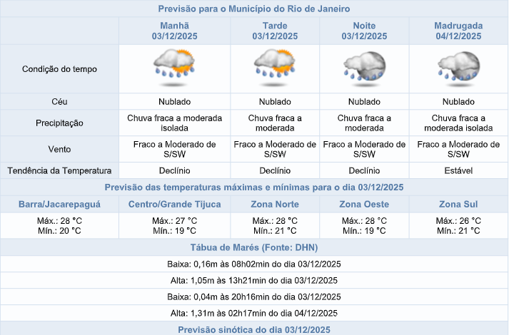 Segundo o Sistema Alerta Rio, nesta quarta-feira (03/12), o tempo segue instável no município do Rio, devido ao deslocamento de um sistema de baixa pressão no oceano. O céu estará nublado e há previsão de chuva fraca a moderada isolada a qualquer momento. Os ventos irão variar entre fracos e moderados e as temperaturas apresentarão declínio, com mínima prevista de 19°C e máxima prevista de 28°C.