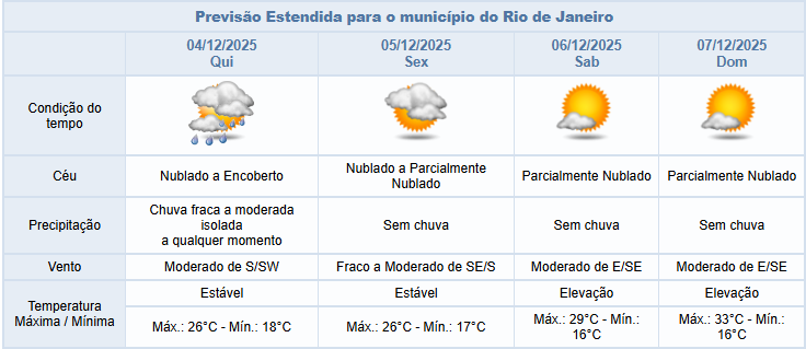 Na quinta-feira (04/12), o tempo permanece instável. O céu estará nublado a encoberto e há previsão de chuva fraca a moderada na madrugada/manhã passando a chuva fraca a partir da tarde. Os ventos estarão moderados.