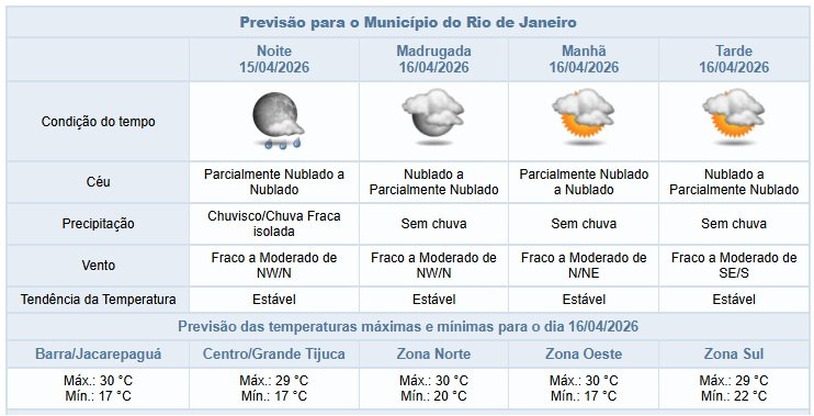 Segundo o Alerta Rio, neste final de tarde e noite de quarta-feira (15/04) o céu estará parcialmente nublado a nublado na cidade do Rio e os ventos fracos a moderados. No final da noite há previsão de chuvisco/chuva fraca pontual e isolada devido a ventos úmidos do oceano. Ao longo do dia, houve registros isolados de chuvisco/chuva fraca, temperatura mínima registrada de 16,2°C e máxima de 30,2°C.