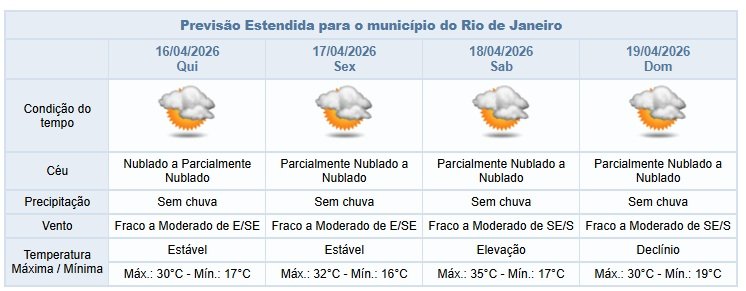 Entre a quinta-feira e o domingo (16/04 e 19/04), a previsão é de nebulosidade variada e sem ocorrência de chuva. Os ventos estarão fracos a moderados.