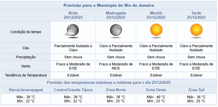 De acordo com o Alerta Rio, neste final de tarde e na noite desta quarta-feira, véspera de Natal (24/12), o céu estará claro a parcialmente nublado na cidade do Rio de Janeiro e não há previsão de chuva. Os ventos estarão moderados.