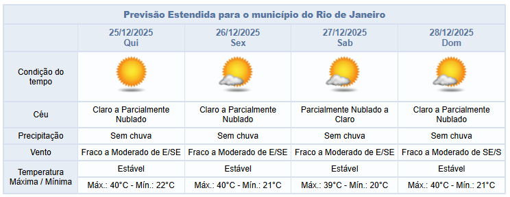 Entre a quinta-feira e o domingo (25/12 a 28/12), a previsão é de céu claro a parcialmente nublado e sem chuva. Os ventos estarão fracos a moderados, e as temperaturas permanecerão elevadas.