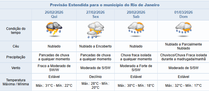 Na quinta e sexta-feira (26/02 e 27/02) em função da formação e atuação de um sistema de baixa pressão no litoral, a previsão para a capital fluminense é de nebulosidade variada e chuva fraca a moderada ao longo do dia, sendo em caráter de pancada e acompanhada de raios a partir da tarde de quinta-feira. Os ventos estarão moderados.