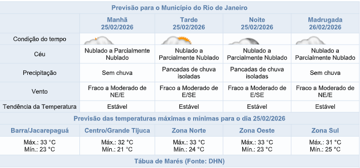 De acordo com o Sistema Alerta Rio, as condições atmosféricas nesta quarta-feira (25/02) na capital fluminense, serão influenciadas pelo calor e áreas de instabilidade. A previsão é de céu parcialmente nublado a nublado, com pancadas de chuva a partir da tarde. Os ventos estarão fracos a moderados e as temperaturas seguem estáveis, com máxima prevista de 33°C.