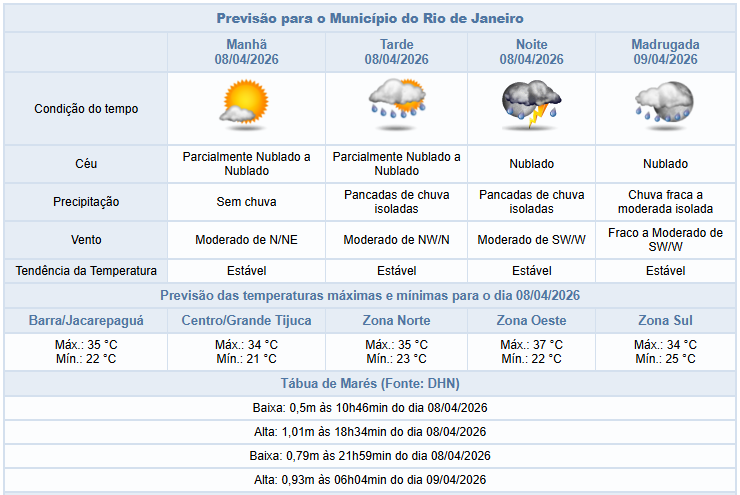 Segundo o Alerta Rio, nesta quarta-feira (8/4), há previsão de pancadas de chuva moderada a forte isoladas, podendo vir acompanhadas de raios a partir da tarde na cidade do Rio. A aproximação de uma frente fria pelo continente influenciará o tempo. O céu estará parcialmente nublado a nublado. Os ventos estarão moderados e as temperaturas seguem elevadas, com máxima prevista de 35°C.