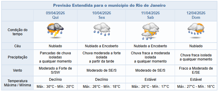 Na quinta-feira (9/4), em função da passagem desta frente fria continental, a previsão para a cidade do Rio é de céu predominantemente nublado com pancadas de chuva moderada a qualquer momento, sendo ocasionalmente fortes isoladas na madrugada e na noite. Os ventos estarão moderados a pontualmente fortes e as temperaturas apresentarão declínio.