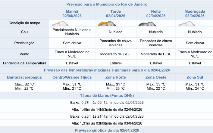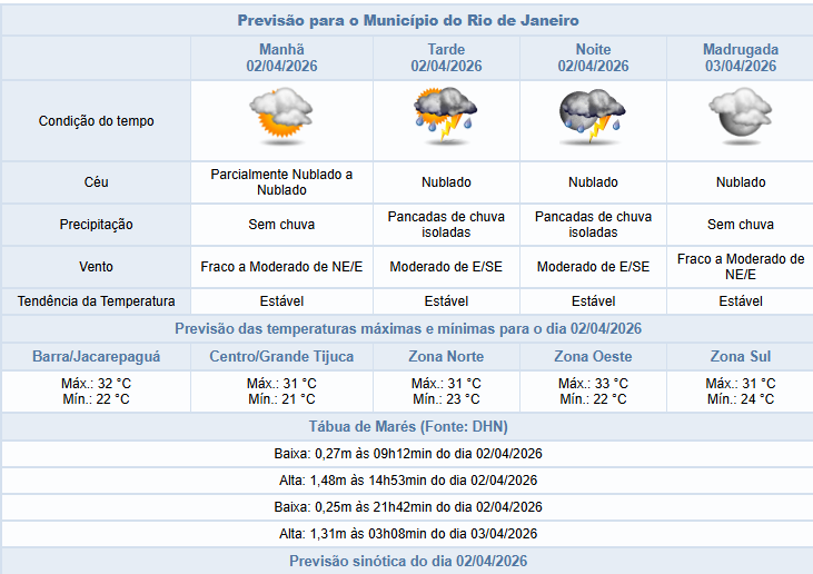 🌧️De acordo com o Sistema Alerta Rio, nesta quinta-feira (02/04), a atuação de áreas de instabilidade irá influenciar as condições do tempo na capital fluminense. A previsão é de aumento de nebulosidade ao longo do dia e de pancadas de chuva isoladas nos períodos da tarde e noite, podendo vir acompanhadas de raios. Os ventos estarão fracos a moderados, e as temperaturas estáveis, com máxima prevista de 33°C.