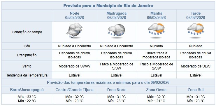 Segundo o Alerta Rio, neste final de tarde e na noite desta quinta-feira (05/02), o céu estará nublado a encoberto na cidade do Rio e há previsão de pancadas de chuva, podendo vir com raios. Ao longo do dia, a temperatura mínima registrada foi de 20,3°C e a máxima de 33°C.