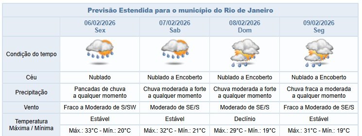 Na sexta-feira (06/02), o tempo permanece sendo influenciado pela atuação de um canal de umidade sobre o Sudeste. Assim, haverá predomínio de céu nublado e há previsão de pancadas de chuva a qualquer momento, sendo mais intensas nos períodos da tarde e noite. Os ventos estarão fracos a moderados.