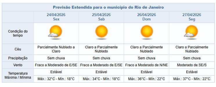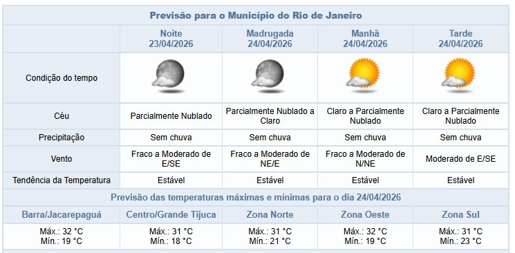 Segundo o Alerta Rio, neste fim de tarde e na noite desta quinta-feira (23/04) o céu estará claro a parcialmente nublado na cidade do Rio e não há previsão de chuva. Os ventos estarão fracos a moderados. Ao longo do dia, as temperaturas permaneceram estáveis, com mínima registrada de 16,6°C e máxima de 31,4°C.