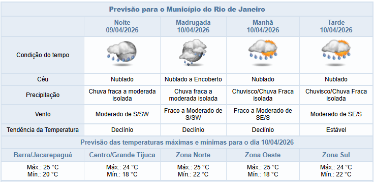 Segundo o Alerta Rio, nesta noite de quinta-feira (9/04) o céu estará nublado na cidade do Rio, os ventos ocasionalmente moderados e há previsão de chuva fraca a moderada isolada. Ao longo do dia, as temperaturas apresentaram leve declínio em relação ao dia anterior, com mínima registrada de 21,8°C e máxima de 34,1°C.