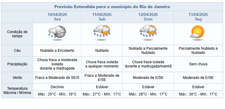 No sábado e domingo (11/04 e 12/04) o tempo na cidade do Rio permanecerá instável em função da atuação de ventos úmidos. Há previsão de chuva fraca isolada até o período da manhã de domingo. Os ventos estarão fracos a moderados.