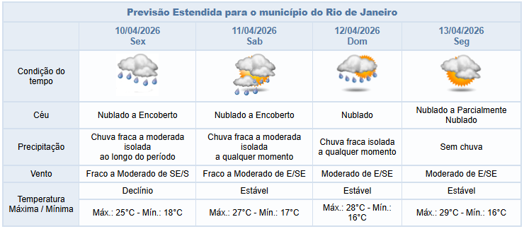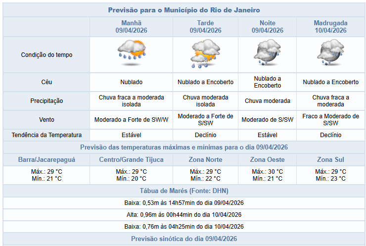 Segundo o Alerta Rio, nesta quinta-feira (9/4), há previsão de chuva fraca a moderada isolada no período da manhã e chuva moderada a partir da tarde na cidade do Rio. O tempo será influenciado pelo deslocamento de uma frente fria e posterior transporte de umidade do oceano para o continente. Haverá aumento de nebulosidade com predomínio de céu nublado. Os ventos estarão moderados a pontualmente fortes e as temperaturas apresentarão declínio, com mínima prevista de 20°C e máxima prevista de 30°C.