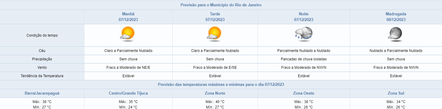 Segundo o Alerta Rio, nesta quinta-feira (07/12), o tempo na cidade do Rio de Janeiro será influenciado por áreas de instabilidade associadas à aproximação de uma frente fria. A cobertura do céu irá variar entre claro e parcialmente nublado na maior parte do dia, passando para nublado à noite, e há previsão de pancadas rápidas e isoladas de chuva moderada no período da noite. Os ventos estarão fracos a moderados e as temperaturas seguem estáveis, com mínima de 24°C e máxima de 40°C.