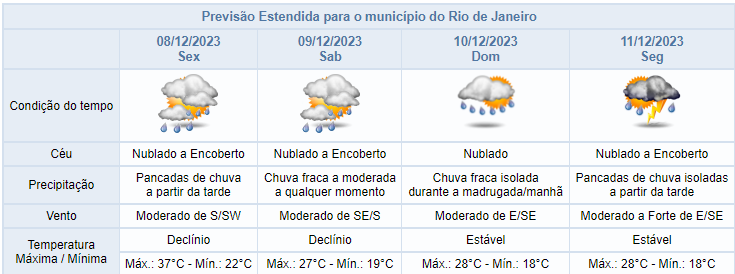 Ainda segundo o Alerta Rio, na sexta-feira (08/12), a aproximação e o lento deslocamento de uma frente fria sobre o oceano manterão o tempo instável, com previsão de pancadas de chuva a partir da tarde. A chuva poderá passar de 25mm/h em pelo menos um ponto da cidade. As temperaturas estarão em declínio.
