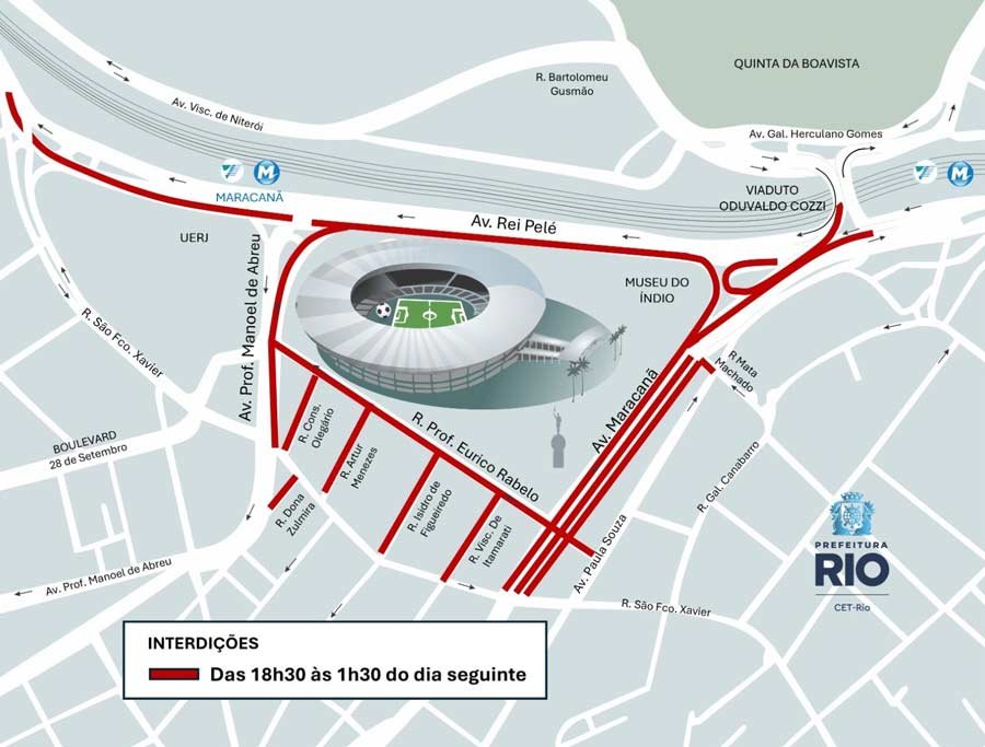 O Centro de Operações e Resiliência da Prefeitura do Rio (COR-Rio) informa que um esquema especial de trânsito foi elaborado pela CET-Rio para as vias no entorno do Maracanã, nesta quinta-feira (26/2), para a realização da partida entre Flamengo x Lanus (ARG), às 21h30, pela Recopa Sul-Americana. As interdições ao trânsito de veículos na região começam a partir das 18h30 e vão até 1h30 de sexta-feira (27/02). Além dos locais regulamentados com proibição de estacionamento, outras vias também estarão restritas ao estacionamento a partir das 10h.