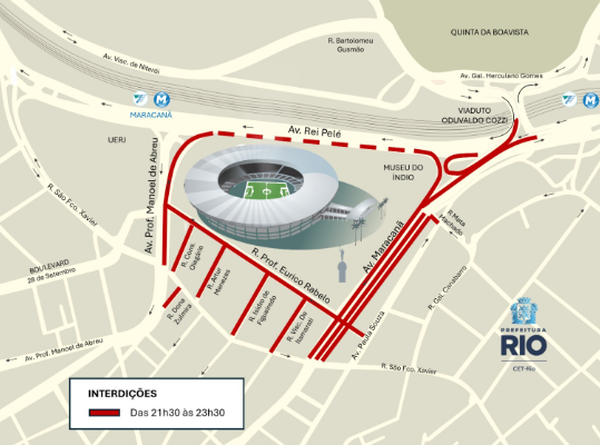 O Centro de Operações e Resiliência da Prefeitura do Rio (COR-Rio) informa que a CET-Rio elaborou uma operação especial de trânsito para vias no entorno do estádio do Maracanã visando à realização do show Sorriso As Antigas, no sábado (11/10).