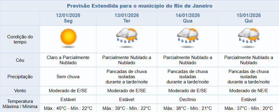 Entre terça e quinta-feira (13/01 e 15/01), por conta da atuação de áreas de instabilidade associadas ao calor, a previsão para a cidade do Rio é de céu parcialmente nublado a nublado com pancadas de chuva isoladas na tarde/noite. Os ventos estarão moderados.
