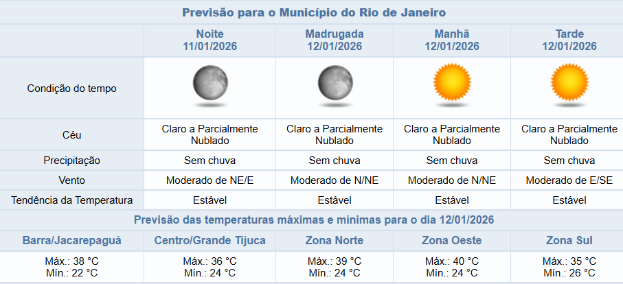 Na segunda-feira (12/01), o céu estará com poucas nuvens na cidade do Rio e não há previsão de chuva. Os ventos estarão predominantemente moderados e as temperaturas elevadas. A umidade relativa do ar poderá apresentar valores abaixo de 30% no período da tarde.