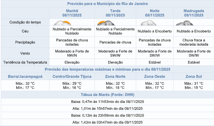 Segundo o Sistema Alerta Rio, as condições atmosféricas, neste sábado (08/11), no município do Rio, serão influenciadas pelo deslocamento de um sistema de baixa pressão, associado com uma frente fria. A nebulosidade estará variada e há previsão de pancadas isoladas de chuva a partir da manhã. Os ventos estarão moderados (18,5 km/h a 51 km/h) a fortes (51 km/h a 76 km/h), podendo apresentar rajadas muito fortes (acima de 76 km/h). As temperaturas estarão em elevação, com máxima prevista de 32°C.