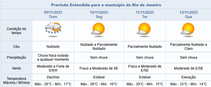 Já entre a próxima segunda-feira e quarta-feira (10/11 e 12/11), o posicionamento de um sistema de alta pressão irá influenciar o tempo na cidade do Rio. Haverá redução gradativa de nebulosidade e não há previsão de chuva. Os ventos estarão fracos a moderados.