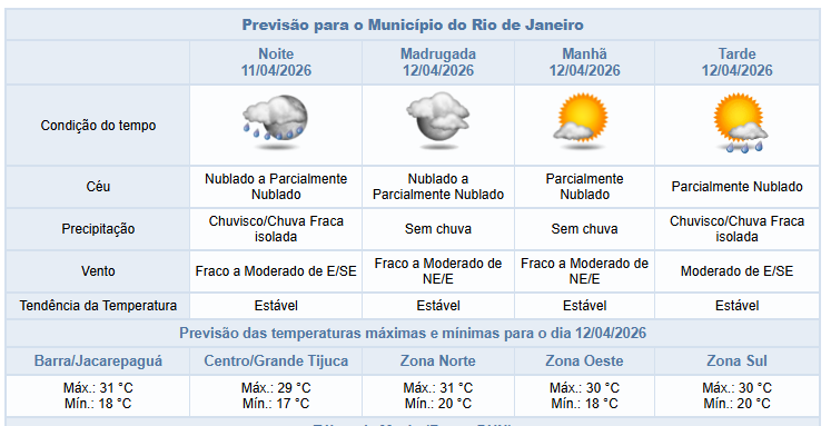 Segundo o Alerta Rio, neste fim de tarde e na noite deste sábado (11/04) o céu estará nublado a parcialmente nublado na cidade do Rio e há previsão de chuvisco/chuva fraca isolada. Os ventos estarão fracos a moderados. Ao longo do dia, os ventos estiveram fracos a moderados e as temperaturas permaneceram estáveis, com mínima registrada de 16,4°C e máxima de 29,3°C.