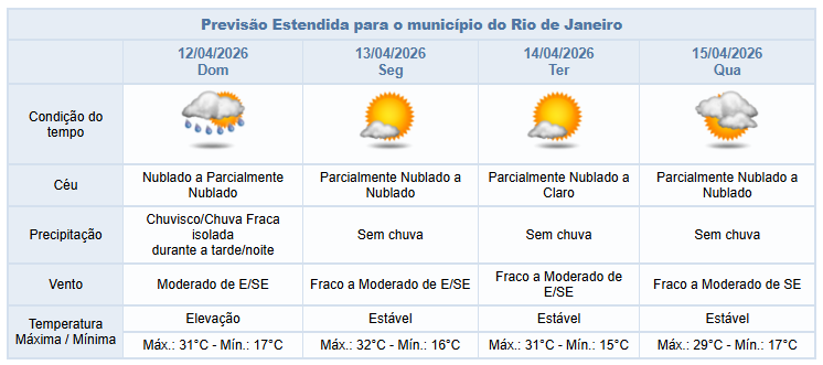 Entre segunda e quarta-feira (13/04 e 15/04) há previsão de nebulosidade variada, mas sem chuva. Os ventos estarão fracos a moderados.