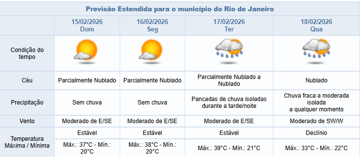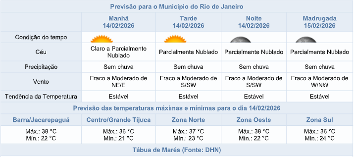 Segundo o Sistema Alerta Rio, para este sábado (14/02), a previsão é de céu claro a parcialmente nublado, sem ocorrência de chuva. Os ventos estarão fracos a moderados e as temperaturas elevadas, com máxima prevista de 38°C.