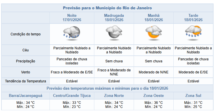 Segundo o Alerta Rio, neste final de tarde e na noite deste sábado (17/01) a nebulosidade estará variada na cidade do Rio de Janeiro e há previsão de pancadas de chuva rápidas e isoladas. Os ventos estarão moderados.