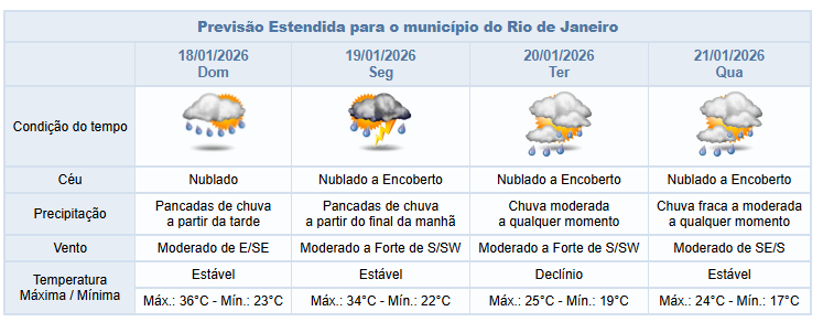No domingo (18/01), em função da atuação de áreas de instabilidade junto ao calor, a previsão é de nebulosidade variada com pancadas de chuva isoladas na tarde/noite. Os ventos estarão predominantemente moderados.