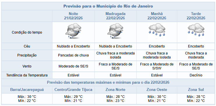 Segundo o Alerta Rio, neste final de tarde e noite de sábado (21/02) o céu estará nublado na cidade do Rio e há previsão de pancadas de chuva isoladas, podendo vir com raios. Os ventos estarão moderados. Ao longo do dia, as temperaturas permaneceram estáveis, com mínima registrada de 22,5°C e máxima de 33,2°C.