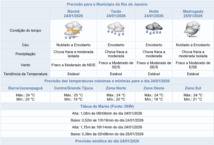 Segundo o Sistema Alerta Rio, o tempo irá se manter instável na capital fluminense, neste sábado (24/01). A previsão é de predomínio de céu encoberto e chuva fraca a moderada a qualquer momento, principalmente nos períodos da tarde e noite. Os ventos estarão fracos a moderados e as temperaturas estáveis, com mínima prevista de 19°C e máxima prevista de 25°C.