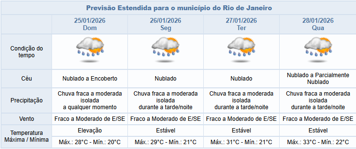 No domingo (25/01), o tempo segue instável, com previsão de chuva fraca a moderada isolada a qualquer momento. Os ventos estarão fracos a moderados.