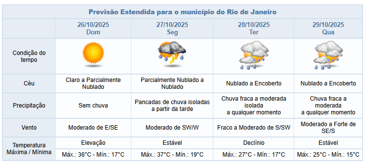 Na segunda-feira (27/10), uma região de baixa pressão no litoral do estado irá influenciar o tempo na capital fluminense. Haverá aumento de nebulosidade e há previsão de pancadas de chuva isoladas a partir da tarde, podendo vir com raios. Os ventos estarão moderados, sendo mais intensos no período da tarde e as temperaturas permanecerão elevadas.