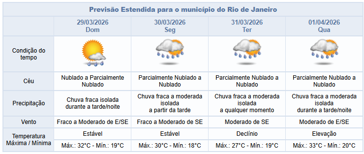 No domingo (29/3), o tempo no Rio será influenciado por áreas de instabilidade e pela entrada de umidade. A nebulosidade estará variada, com predomínio de céu parcialmente nublado e previsão de chuva fraca isolada na tarde/noite. Os ventos estarão fracos a moderados.