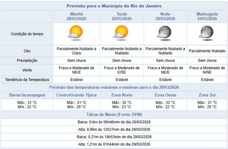 Segundo o Alerta Rio, neste sábado (28/3), não há previsão de chuva na cidade do Rio. O tempo não apresentará mudanças significativas e a previsão é de predomínio de céu parcialmente nublado. Os ventos estarão fracos a moderados e as temperaturas estarão estáveis, com mínima prevista de 20°C e máxima prevista de 33°C.