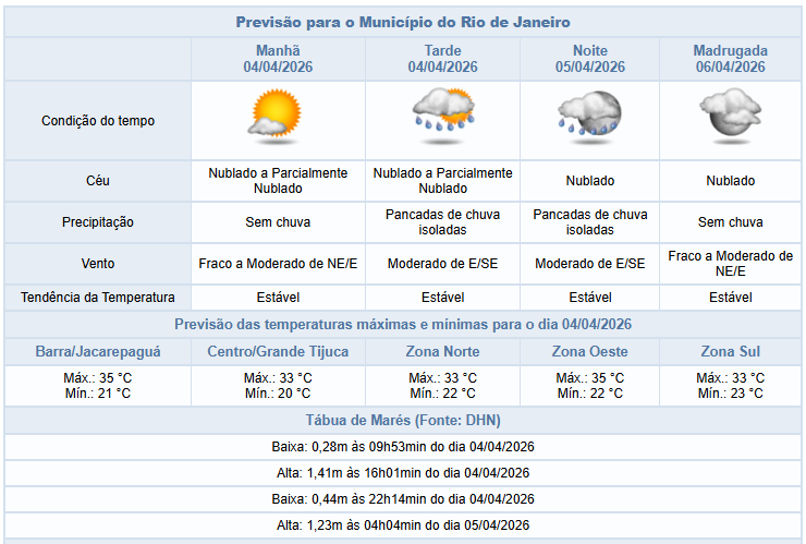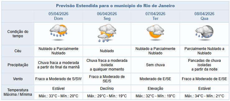 Segundo o Alerta Rio, neste sábado (4/4), há previsão de pancadas de chuva isoladas a partir da tarde, podendo vir acompanhadas de raios, na cidade do Rio. O tempo será influenciado por áreas de instabilidades associadas ao calor, com aumento da nebulosidade. Os ventos estarão fracos a moderados e as temperaturas seguem elevadas, com máxima prevista de 35ºC.