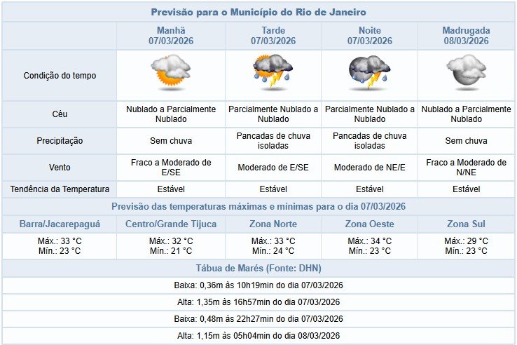 Segundo o Alerta Rio, neste sábado (7/3), há previsão de pancadas isoladas de chuva moderada a forte, podendo vir acompanhadas de raios a partir da tarde. O tempo na cidade será influenciado por áreas de instabilidade associadas ao calor e a umidade. Ao longo do dia, a nebulosidade estará variada. Os ventos estarão fracos a moderados e as temperaturas estáveis, com máxima prevista de 34°C.
