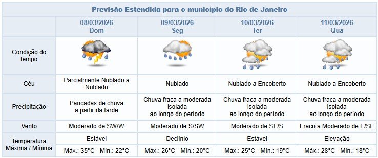 No domingo (08/03), o tempo na cidade do Rio será influenciado pela aproximação e passagem de uma frente fria. O céu estará parcialmente nublado a nublado e há previsão de pancadas de chuva, moderada a ocasionalmente forte, a partir da tarde, podendo vir com raios. Os ventos estarão moderados.