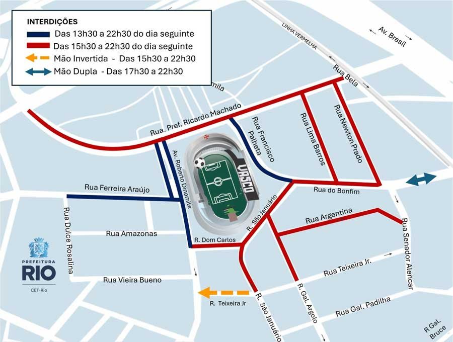 O Centro de Operações e Resiliência da Prefeitura do Rio (COR-Rio) informa que um esquema de trânsito foi elaborado pela CET-Rio para as vias no entorno do Estádio São Januário, nesta quinta-feira (12/3), para a realização da partida Vasco x Palmeiras, às 19h30, pelo Campeonato Brasileiro. As interdições começam às 13h30, com previsão de liberação às 22h30.
