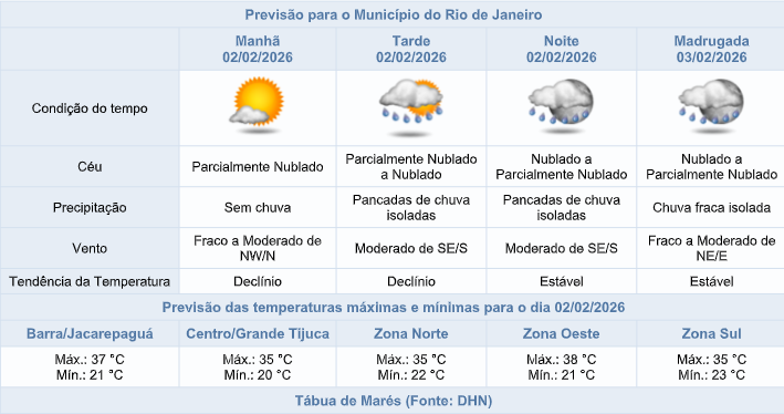De acordo com o Sistema Alerta Rio, nesta segunda-feira (2/2), o tempo segue instável na capital fluminense. A nebulosidade estará variada ao longo do dia e há previsão de pancadas de chuva isoladas a partir da tarde, podendo vir acompanhadas de rajadas de vento moderado. As temperaturas estarão estáveis e elevadas, com mínima prevista de 20°C e máxima prevista de 38°C.
